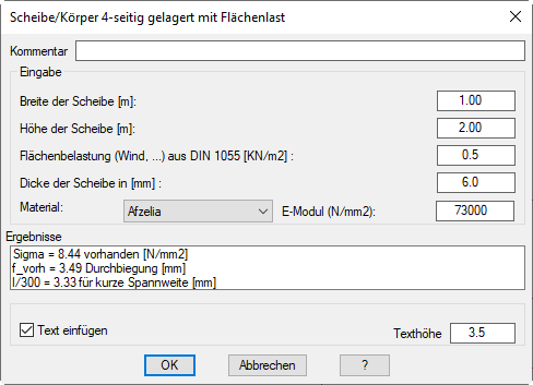 Im Eingabefeld Breite der Scheibe [m] geben Sie die Breite des Körpers in m ein. Im Eingabefeld Höhe der Scheibe [m] geben Sie die Höhe des Körpers in m ein. Im Eingabefeld Flächenbelastung (Wind) aus DIN 1055 [N/mm²] geben Sie die Flächenbelastung ein, die auf den Körper wirkt. In der vertikalen Einbauweise der Scheibe oder des Körpers (Windlast) können Sie folgende Werte zu Grunde legen: (Staudruck lt. Wendehorst):