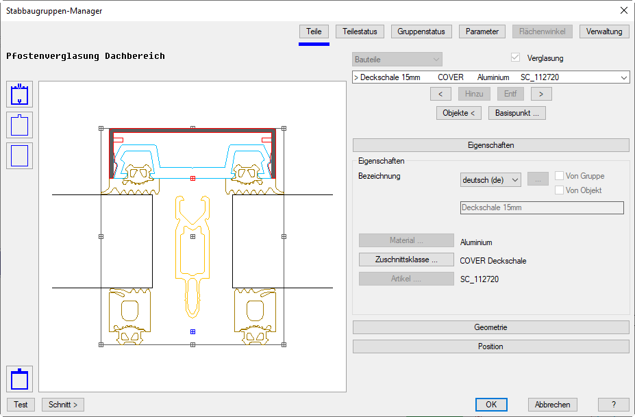 Stabbaugruppe sowie deren Eigenschaften. Hier können Sie ein Bauteil selektieren um dessen Eigenschaften zu ändern. Das selektierte Bauteil wird in der Voransicht rot dargestellt.