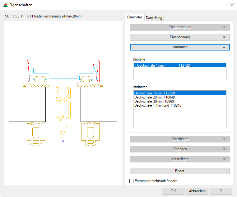Das Dialogfeld enthält auf der linken Seite eine Vorschau des geschnittenen Stabes. Wenn Sie Eigenschaften des Stabes ändern, werden diese unmittelbar angezeigt.