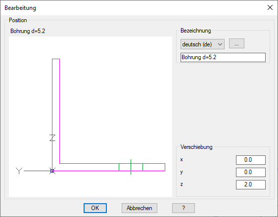 Die Vorschau zeigt den Querschnitt der Projektion sowie die Bearbeitung, die Sie durch Eingabe von Koordinaten verschieben können. Zur besseren Orientierung wird ein Koordinatensymbol eingeblendet.