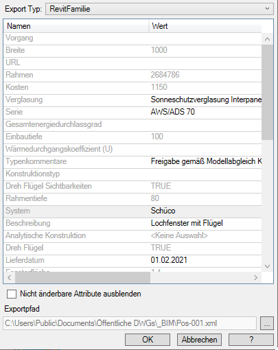 Beim Import der Revit-Familie werden deren Attribute aus einer *.xml Datei eingelesen und hier dargestellt. Sie können an dieser Stelle alle Textattribute anpassen.