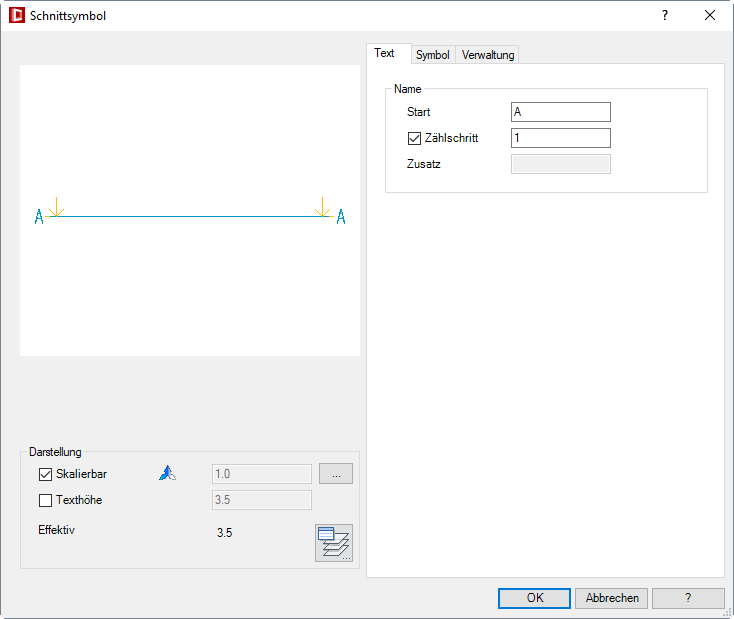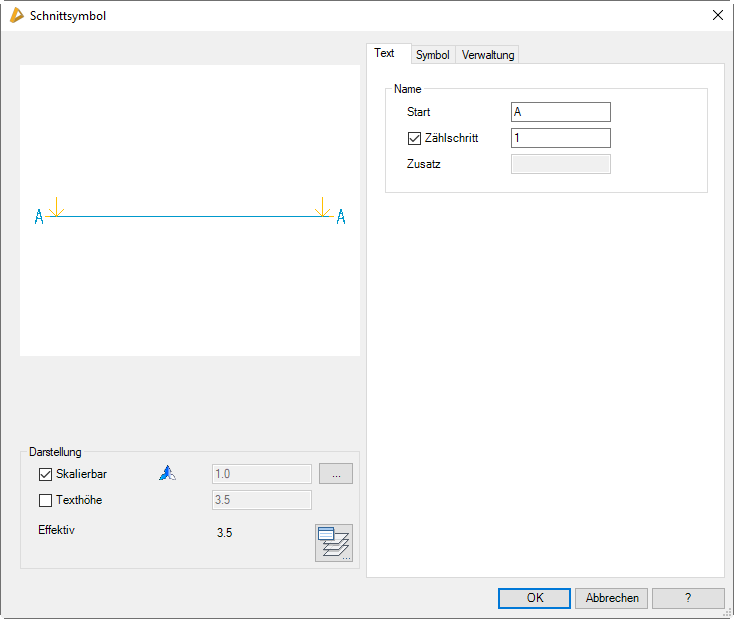 | Bei aktivierter Skalierbarkeit wird das Schnittsymbol abhängig vom Beschriftungsmaßstab automatisch skaliert. Eine Änderung des Skalierfaktors ist daher nicht möglich. |