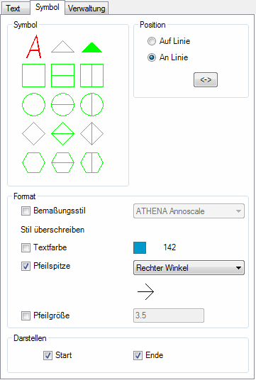 Definiert das Symbol. Das gewählte Symbol wird rot angezeigt. Abhängig vom gewählten Symbol können Position sowie Pfeilspitze beeinflusst werden.