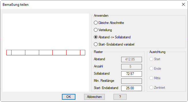 Mit diesem Befehl können Sie eine lineare Strecke nach bestimmten Regeln mit einer Kettenbemaßung bemaßen. Die Bemaßungsregeln definieren Sie in einem Dialogfeld.