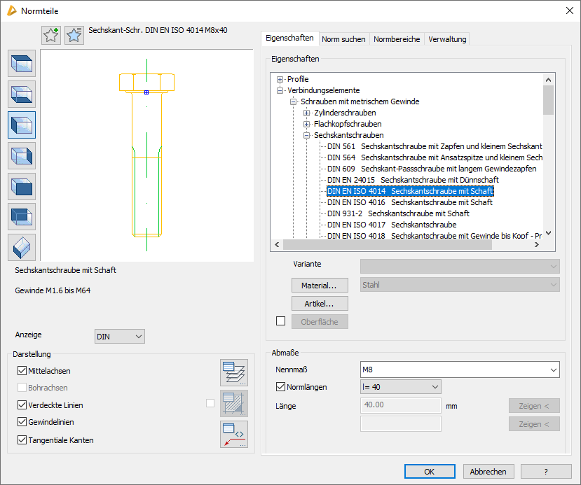 Bestimmt welche Norm (DIN, ISO oder EN) angezeigt werden soll. Wird eine andere Norm als die DIN gewählt und ein Teil ist in dieser Norm nicht verfügbar, werden DIN Teile dennoch angezeigt, sind jedoch durch spitze Klammern gekennzeichnet, Bsp.: <DIN 6914>.