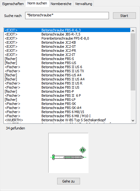 Zeigt die gefundenen Normgruppen an. Wählen Sie hier die Norm aus und Klicken Sie den Button Gehe zu an.