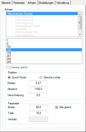 Bewirkt, dass identische Achsmaße für Achsen in einer Flucht verwendet werden. Deaktivieren Sie diesen Schalter, wenn Sie unterschiedliche Achsmaße einstellen möchten.