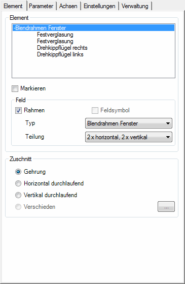 In einer Baumstruktur werden die Rahmen und Flügel des Elementes aufgelistet. Markieren Sie hier ein Objekt, werden dessen Eigenschaften weiter unten im Dialogfeld angezeigt und können angepasst werden.