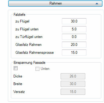 Aktiviert Einspannrahmenprofile für die Fensterrahmen. Es werden zusätzliche Eingabefelder freigegeben, wo Sie die zusätzlich benötigten Abmaße angeben können. Der untere Einspannrahmen muss separat aktiviert werden.