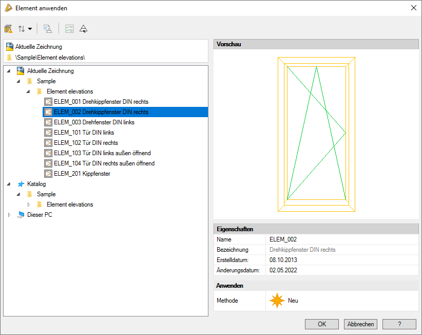 Fügt ein gespeichertes Element (Fenster- Türelement) als