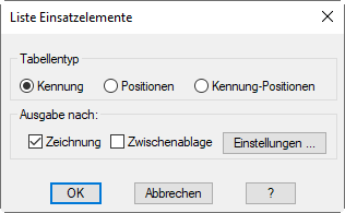 Nach dem beenden des Dialogfeldes mit OK wird die Liste der Einsatzelemente je nach Einstellung in die Zeichnung eingefügt und/oder in die Zwischenablage kopiert. Nach dem Kopieren in die Zwischenablage erscheint eine Meldung, die Sie bestätigen müssen. Beim Einfügen in die Zeichnung folgt: