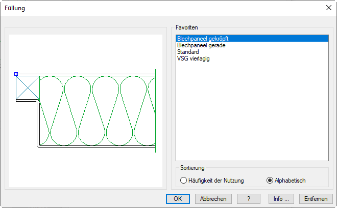 | Die Bezeichnung des gespeicherten Favoriten ist abhängig vom Objekt. Bei den meisten Objekten (Folie, Dämmung, usw.) entspricht sie dem eingestellten Beschriftungstext. Bei frei definierbaren Objekten (Füllung, Wand, usw.) wird die festgelegte Bezeichnung verwendet. |