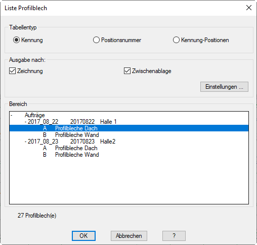 Werkzeugkasten: | ATH Auswerten > Liste Profilblech |