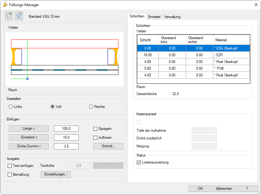 Zeigt die definierten Schichten mit ihren Eigenschaften von außen (Wetter) nach innen (Raum) an. Die Maßeigenschaften wie Schichtdicke und Überstand links/rechts, sind direkt in den Zellen änderbar. Weitere Optionen sind in einem Kontextmenü verfügbar, welches Sie durch Rechtsklick aktivieren können.