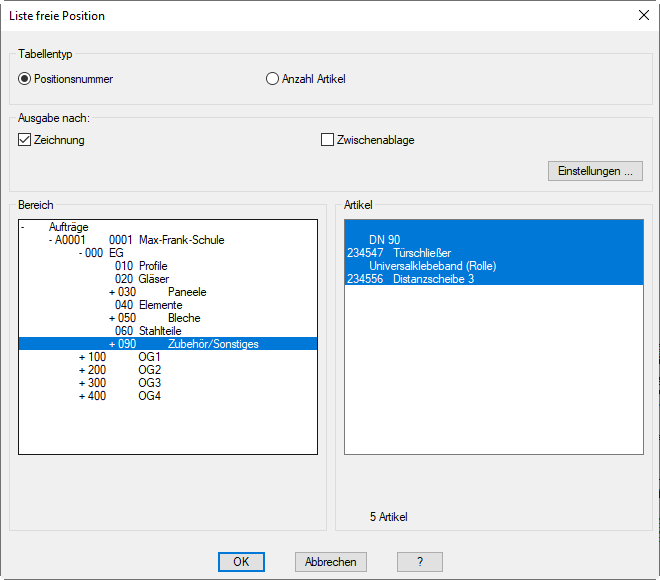 Dialogfeld Liste freie Position können Sie festlegen was in die Stückliste geschrieben werden soll.