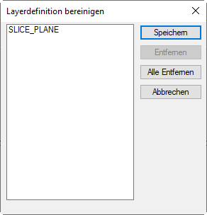 Im linken Bereich des Dialogfeldes werden alle unreferenzierten Layer angezeigt. Sie können einen oder mehrere Layer mit der Maus markieren und durch klicken der Schaltfläche Entfernen löschen. Die Schaltfläche Alle Entfernen löscht alle (auch die nicht markierten) Layer aus der Liste. Die Änderungen werden erst wirksam, wenn Sie den Button Speichern anklicken. Durch Abbrechen werden die Änderungen verworfen.