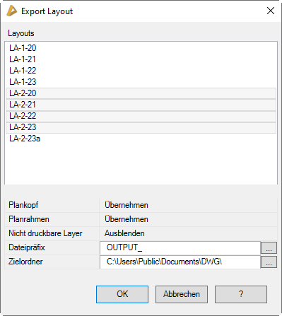 Der Dateiname der neuen Zeichnungen beinhaltet den Namen des jeweiligen Layouts dem optional ein Dateipräfix vorangestellt werden kann. Die Auswahl der Layouts, des Speicherorts sowie weitere Einstellungen erfolgen in einem Dialogfeld.