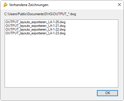 Hie können Sie prüfen, ob und welche Zeichnungen mit dem definierten Layout im angegebenen Ordner bereits vorhanden sind.