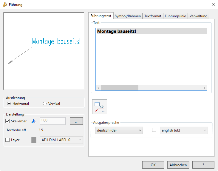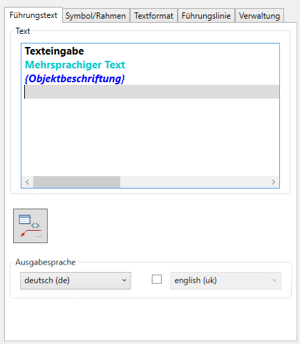 Mit diesem Befehl können Sie für die Beschriftung von Objekten ein- oder mehrzeilige und mehrsprachige Texte mit Führungslinie erstellen. Die Führung kann vielfältig formatiert werden beispielsweise mit einem Rahmen oder Symbol.