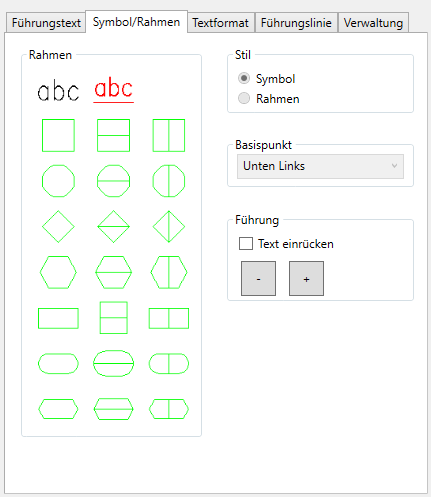 Definiert die Umrandung des Führungstextes als Rahmen. Ein Rahmen umschließt immer den gesamten Führungstext. Die Option Rahmen ist nur für einzellige Symbole verfügbar.