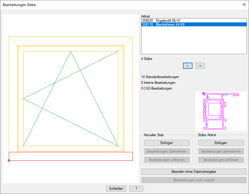 Übernimmt alle Profile des gewählten Artikels incl. manuelle Bearbeitungen für das Element. Die eingefügten 3D-Stäbe werden wieder entfernt.