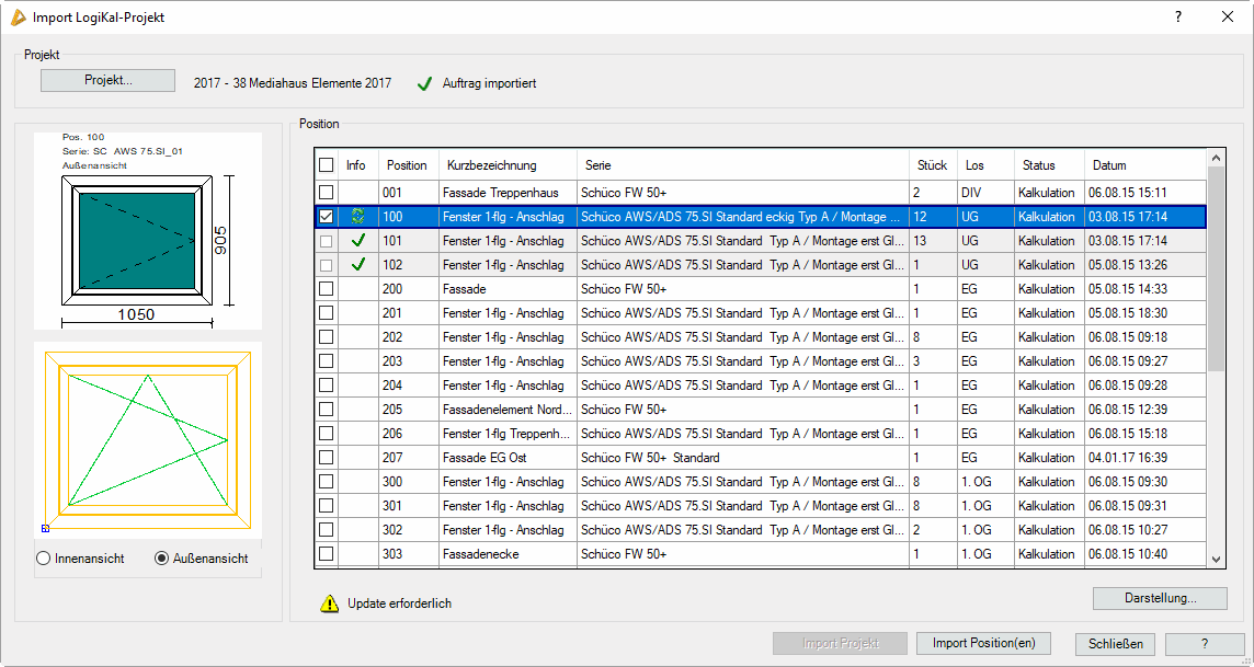 Importiert Projekte und Positionen aus LogiKal in die Zeichnung. Sie können bereits vorhandene Positionen in die Zeichnung importieren oder auch nur ein Projekt ohne Positionen.