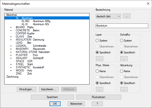 Hier werden alle Materialien in einer Baumstruktur angezeigt. Es erscheint jeweils zuerst der Name, dann die Bezeichnung des Materials in der eingestellten Sprache. Ein + vor dem Material bedeutet das abgeleitete Materialien vorhanden sind. Um einen Materialzweig zu öffnen, müssen Sie diesen mit der Maus anklicken. Die verschiedenen Eigenschaften des gewählten Materials können im rechten Teil des Dialogfeldes und in Unterdialogfeldern geändert werden.