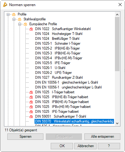 | Sie können nur die Normen entsperren, die direkt gesperrt wurden. Also solche, die mit einem roten Vorhängeschloss markiert sind. |