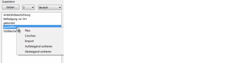 Zeigt alle verfügbaren Zusatztexte an. Sie können einen Text markieren um ihn zu bearbeiten. Wenn Sie einen markierten Text erneut anklicken, wird er zur Bearbeitung freigegeben und kann direkt geändert werden.