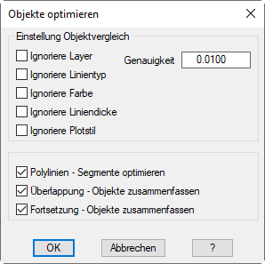 Mit OK beenden Sie das Dialogfeld und können die zu optimierenden Objekte wählen. Die Einstellungen im Dialogfeld werden für die Dauer der Zeichnungssitzung gespeichert. Mit Abbrechen werden die Einstellungen verworfen.