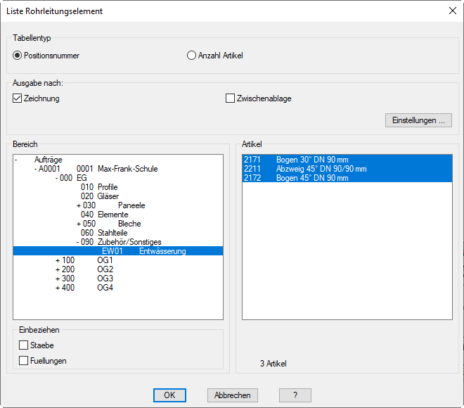 Dialogfeld Liste Rohrleitungselement können Sie festlegen was in die Stückliste geschrieben werden soll.