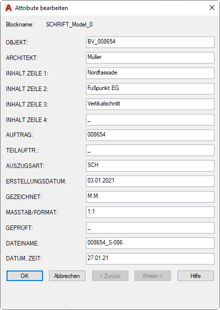 Im Dialogfeld Attribute bearbeiten können Sie die einzelnen Felder des Schriftfeldes ausfüllen bzw. bearbeiten. Zwischen den Feldern wechseln Sie entweder mit der Maus oder mit der Tabulatortaste. Mit den Schaltflächen Nächstes und Vorheriges können Sie die weiteren Zeilen anzeigen, falls erforderlich. Klicken Sie OK um das Dialogfeld zu beenden und das Schriftfeld auszufüllen. Weitere Informationen zum Dialogfeld Attribute bearbeiten finden Sie in der AutoCAD Dokumentation.