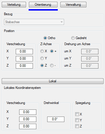 In diesem Bereich wird die Position und Orientierung des Bauteil-Koordinatensystems beschrieben. Alle Angaben werden relativ zum Koordinatensystem des Stabes bestimmt, dessen Ursprung der eingestellte Bezugspunkt ist.