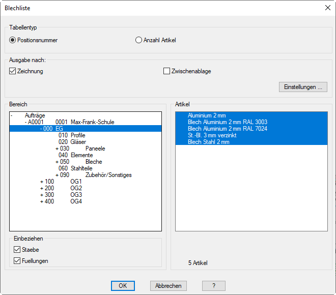 Dialogfeld Liste Blech können Sie festlegen was in die Stückliste geschrieben werden soll.