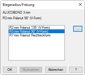 Dialogfeld Biegeradius/Fräsung geöffnet.