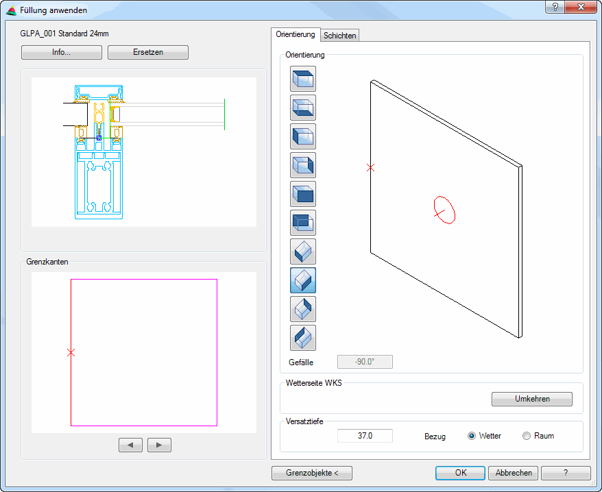 Bestimmt den Abstand der Bezugsseite der Füllung zum Einfügepunkt der Grenzobjekte (z.B. Stäbe). Mit den Optionsfeldern Wetter und Raum legen Sie die Bezugsseite der Füllung fest.