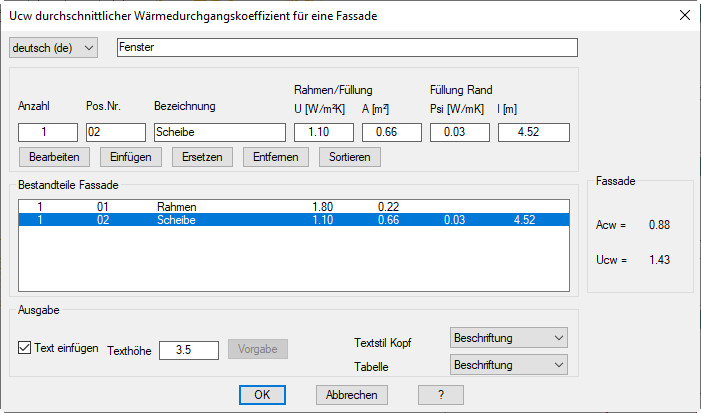 Mit dieser Routine können Sie den durchschnittlichen Wärmedurchgangs-koeffizienten für ein Fenster oder eine Fassade berechnen.