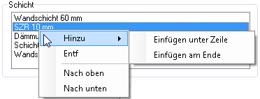 Listet die bereits definierten Wandschichten auf. Sie können hier Wandschichten selektieren um deren Eigenschaften zu ändern. Die selektierte Schicht wird in der Voransicht rot angezeigt.